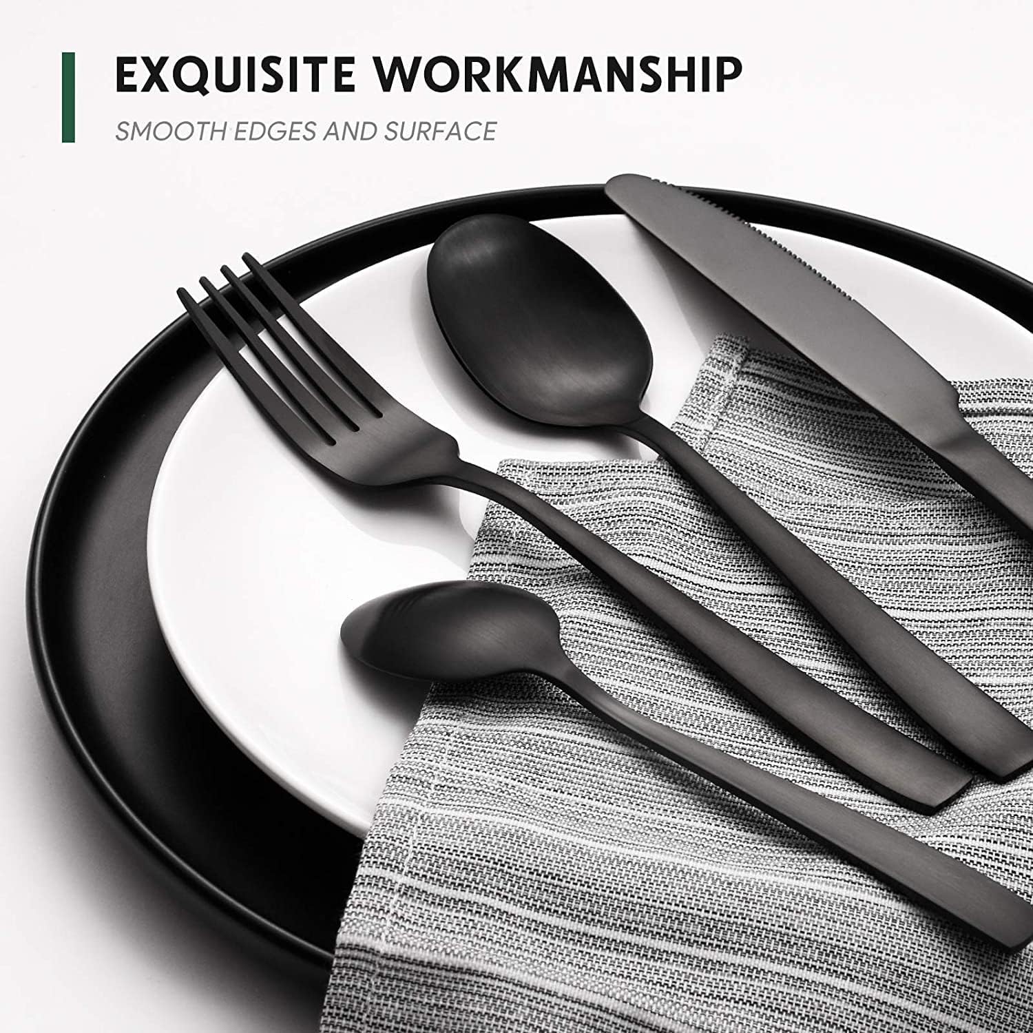 • UNIQUE MATTE BLACK LOOK: The mysterious matte black appearance, standing out from the ordinary silverware, creates an elegant, noble and luxurious dining scenes. The matte texture makes it modern, stylish and fashionable. There is no need to worry about fading or cracking, as this is a metal layer from vacuum plating technology. If you want to be special with the tableware, you won’t miss it. Please kindly note that under strong light, there will be a slight reflection, and the color appears a little bright.