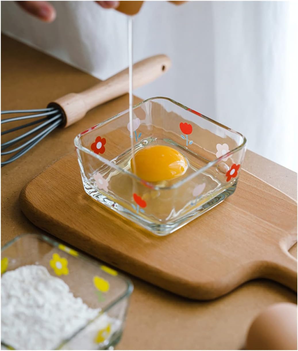 • πŸ‘2.Mini Square clear glass bowl with red yellow flower designed,no fading,Delicate,cute, easy to clean,keep as new even if after long term use.Thick bottom,stable and durable.These floral dessert bowls,we offer 4 style pattern to choose:red daisy,white daisy,mini red yellow flower,tulip.Capcaity is about 9 oz,260ml.