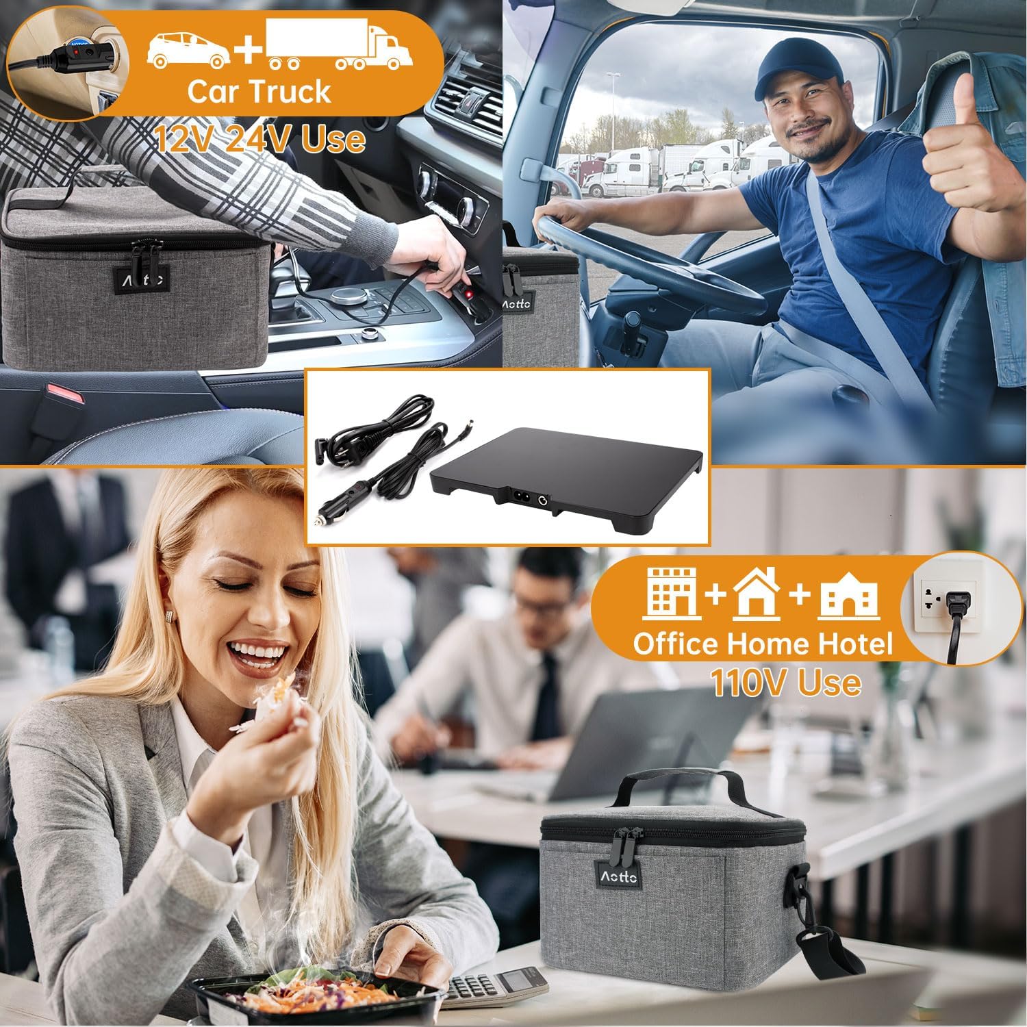 Aotto Portable Oven, Electric Lunch Box Food Heater - 12V/24V/110V 3-in-1 Car Food Warmer - Heated Lunch Box for Adults - Cook, Reheat & Keep Meals Warm for Car, Truck, Travel, Work, Home - Grey