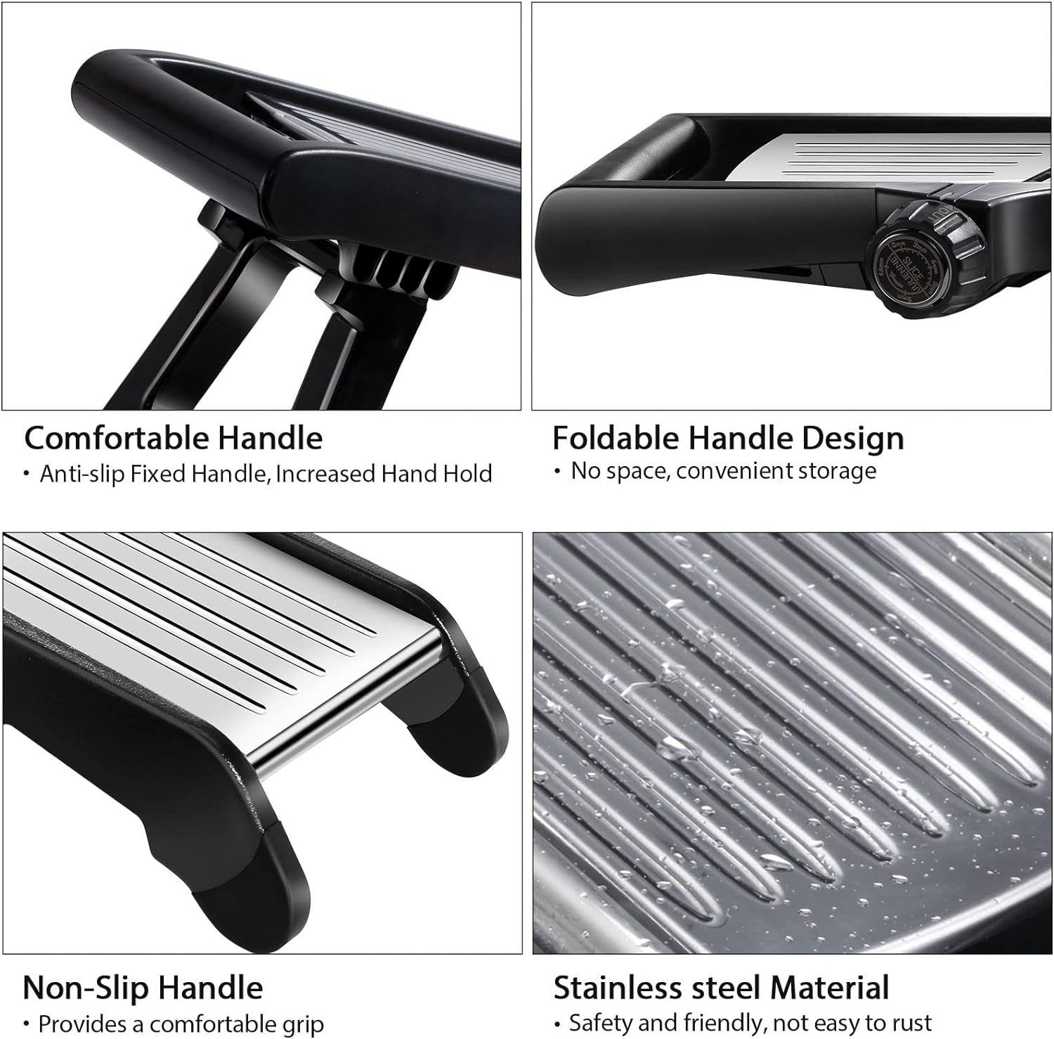 • Save Space:The blades are built-in and does not require extra space for storage. The support handle and anti-slip feet are foldable, making it comfortable to use and easy to fold and store. The slicer can be folded into a flat form for easy storage in a drawer.