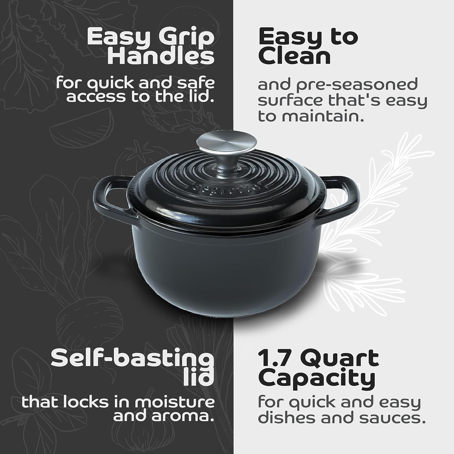 Segretto Cookware Enameled Dutch Oven Pot with Lid Cast Iron Nero (Black) 1.7 Quarts Enamel Small Cast Iron Dutch Oven for Bread Baking, Cooking