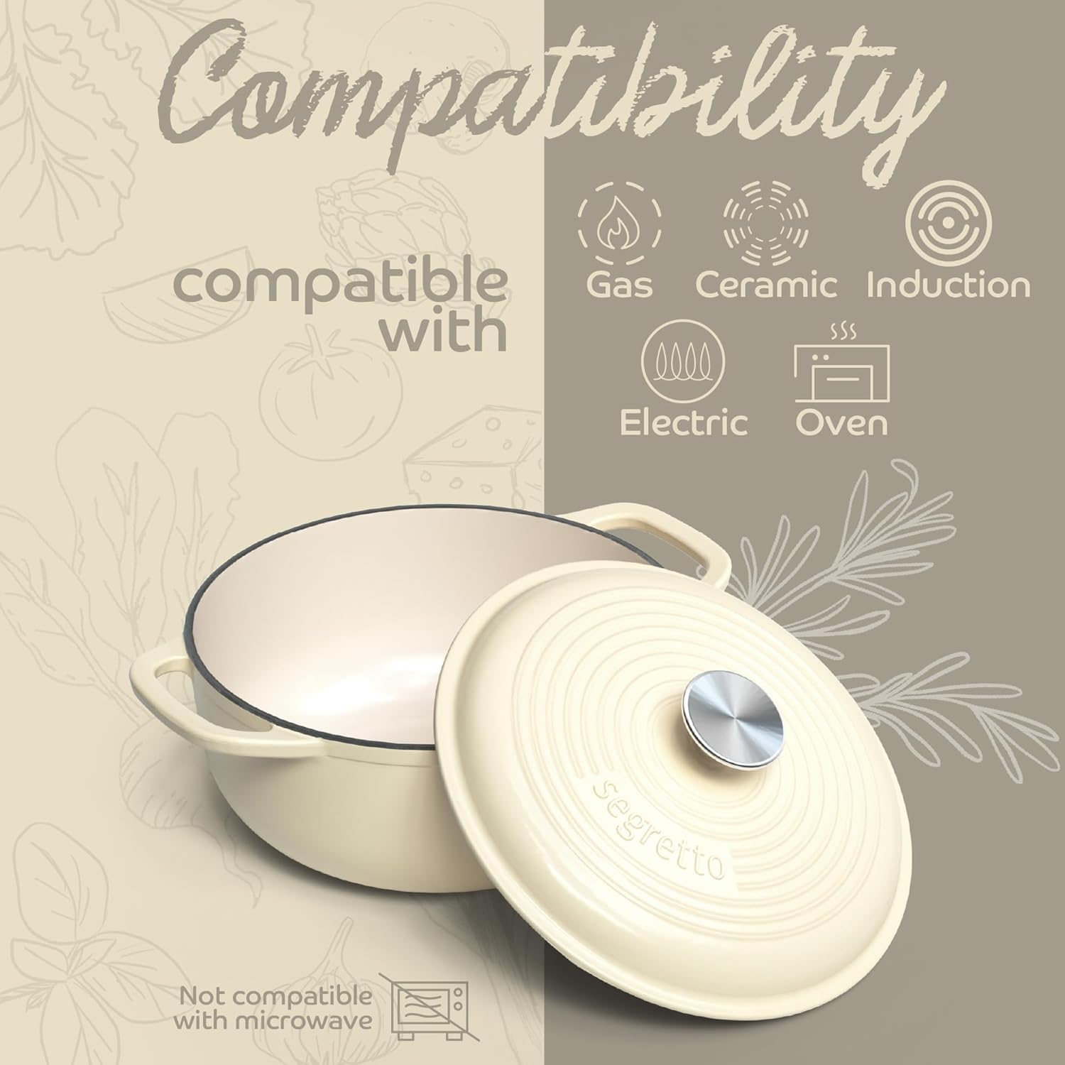 Segretto Cookware Enameled Cast Iron Dutch Oven Pot with Lid 4.57 Quarts, Bianco Perla (Off-White) White Enamel Dutch Oven Cast Iron with Handle Ceramic Cooking Pot for Bread Baking, Basting, Cooking
