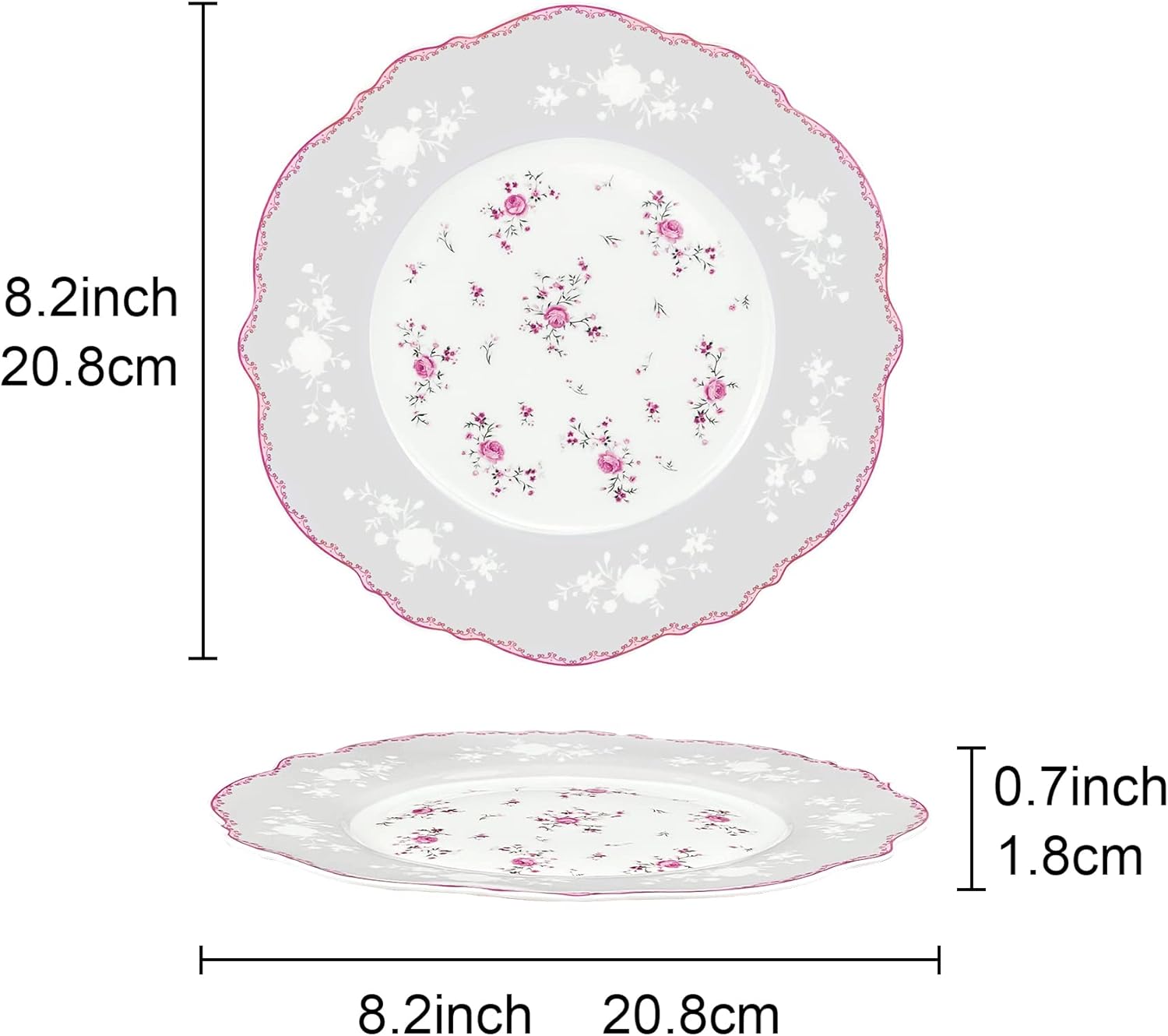 fanquare 8 Inch Porcelain Dessert Plates Set of 4, Lace Serving Bowls Set for Salad, Soup, Pasta, Snack, Pink Roses