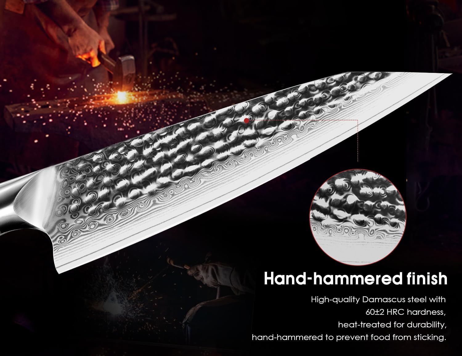 • 【PREMIUM SHARP&HAMMERED TEXTURE】An extremely sharp kitchen knife with a hand-polished sharp edge of 12 degrees per side. Unique hammered texture can prevent food from sticking, helps you to chop、slice or dice any meat、friut、vegetable or any other food easily and smoothly. This 8-inch chef's knife is ideal for professional chefs and everyday kitchens