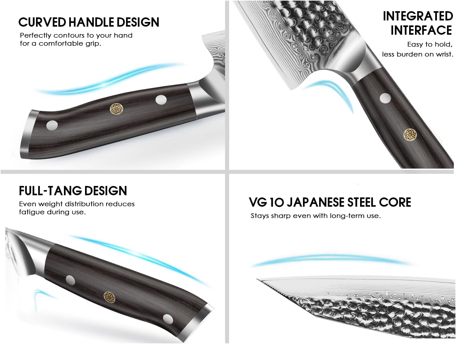 • 【PROFESSIONAL DAMASCUS CHEF KNIFE】The blade is made of Damascus steel, which is anti-rust and anti-corrosion. An excellent balance of hardness, sharpness and toughness makes our chefs knife has good durability. With Japanese VG-10 steel core, the hardness of the steel reaches 62HRC. It can remain its sharpness even after long-term usage