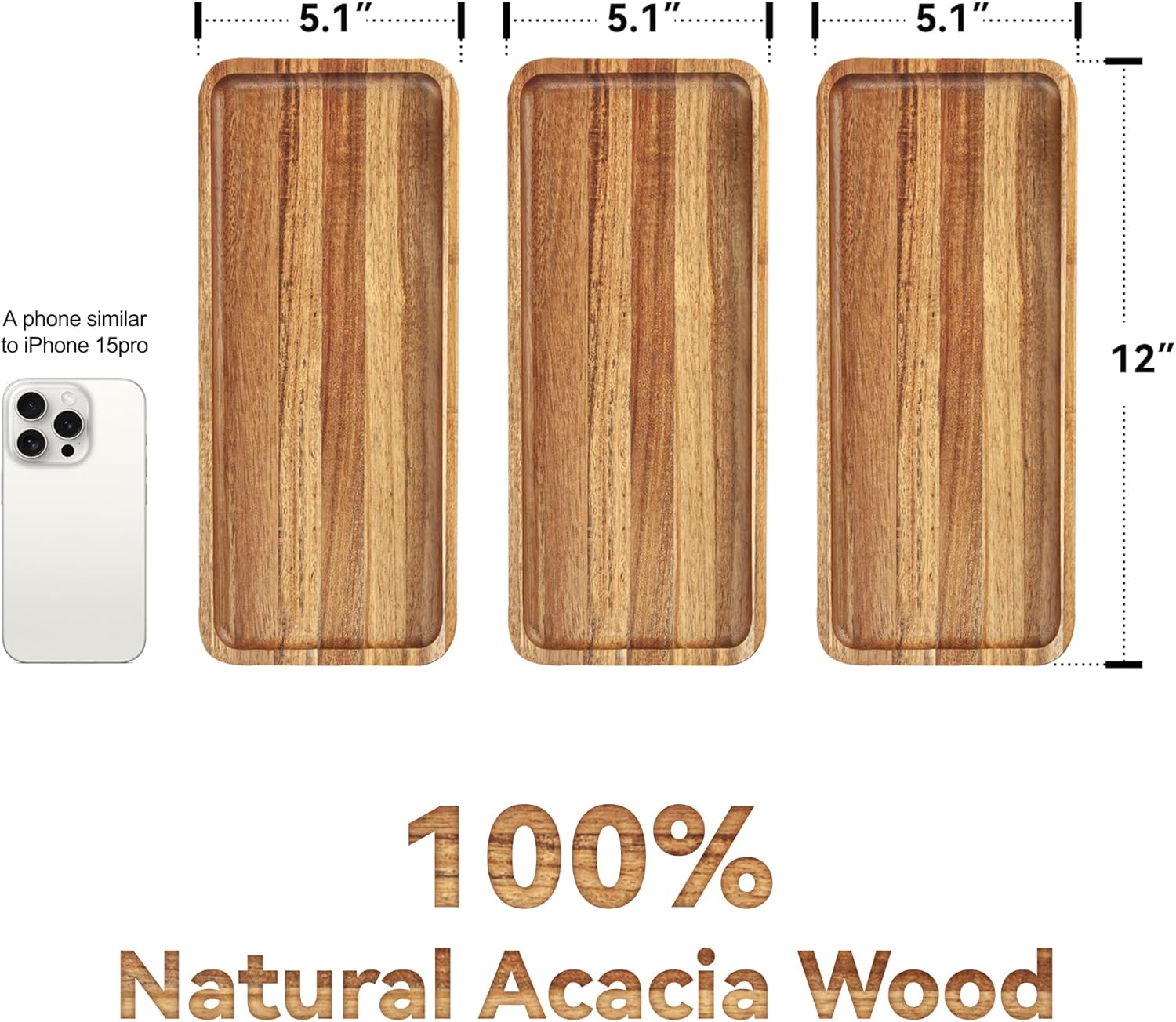 Anyvape Acacia Wood Serving Trays, Set of 3 Wooden Serving Platters for Home Decor, Food, Cheese, Fruit, Vegetables, Charcuterie, Appetizer Serving Tray(11.8 x 5.1 x 0.78 inches)