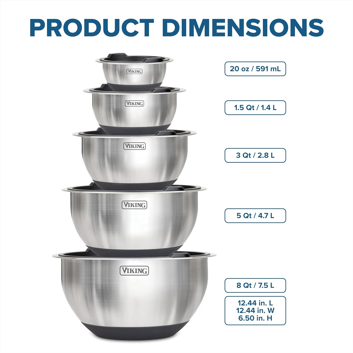 • 10 PIECE MIXING BOWL SET: Elevate your home kitchen and experience culinary precision with our Viking 10-piece Stainless Steel Mixing Bowl Set! This stylish and versatile mixing bowl set includes a 20-oz, 1.5 qt, 3 qt, 5 qt and 8 qt bowl, each with a tight fit lid to seal in liquids and odors