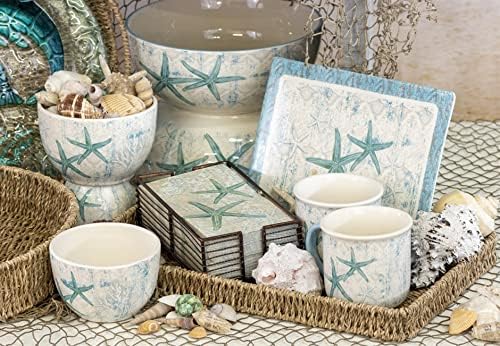 • LAGUNA SHELLS: Charming off-white bowl features teal starfish on subtle patterned background; coastal themed serveware accented with stylish, weathered look, spreader handle coordinates