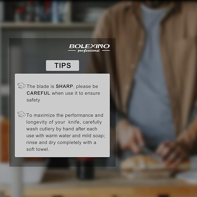 • EASY TO CARE : To maximize the performance and life of your knives, carefully wash cutlery by hand with warm water and mild soap after each use; Wash with a soft towel and dry completely. Do not put it in the dishwasher to avoid damage.