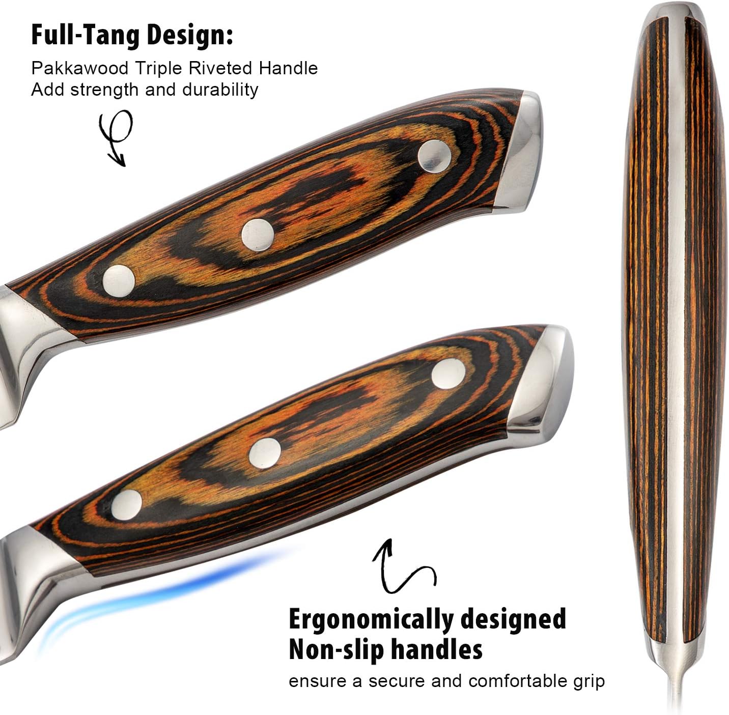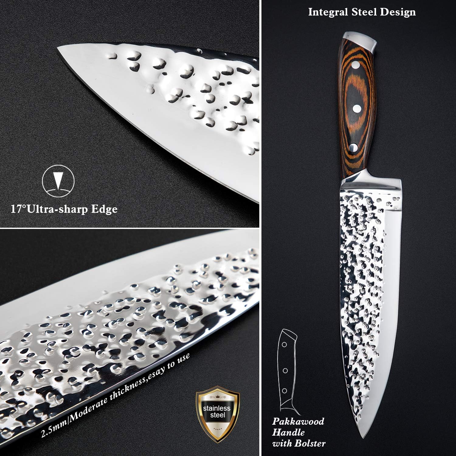 • 【High Quality Kitchen Knife Set】All knives’ blade is forged from Superior high-Carbon stainless steel with excellent corrosion resistance and oxidation resistance.The unique irregular hammer pattern on the blade can effectively prevent food from sticking.A balanced weight distribution and ergonomic handles that it minimize fatigue and maximize the cutting precision for people.