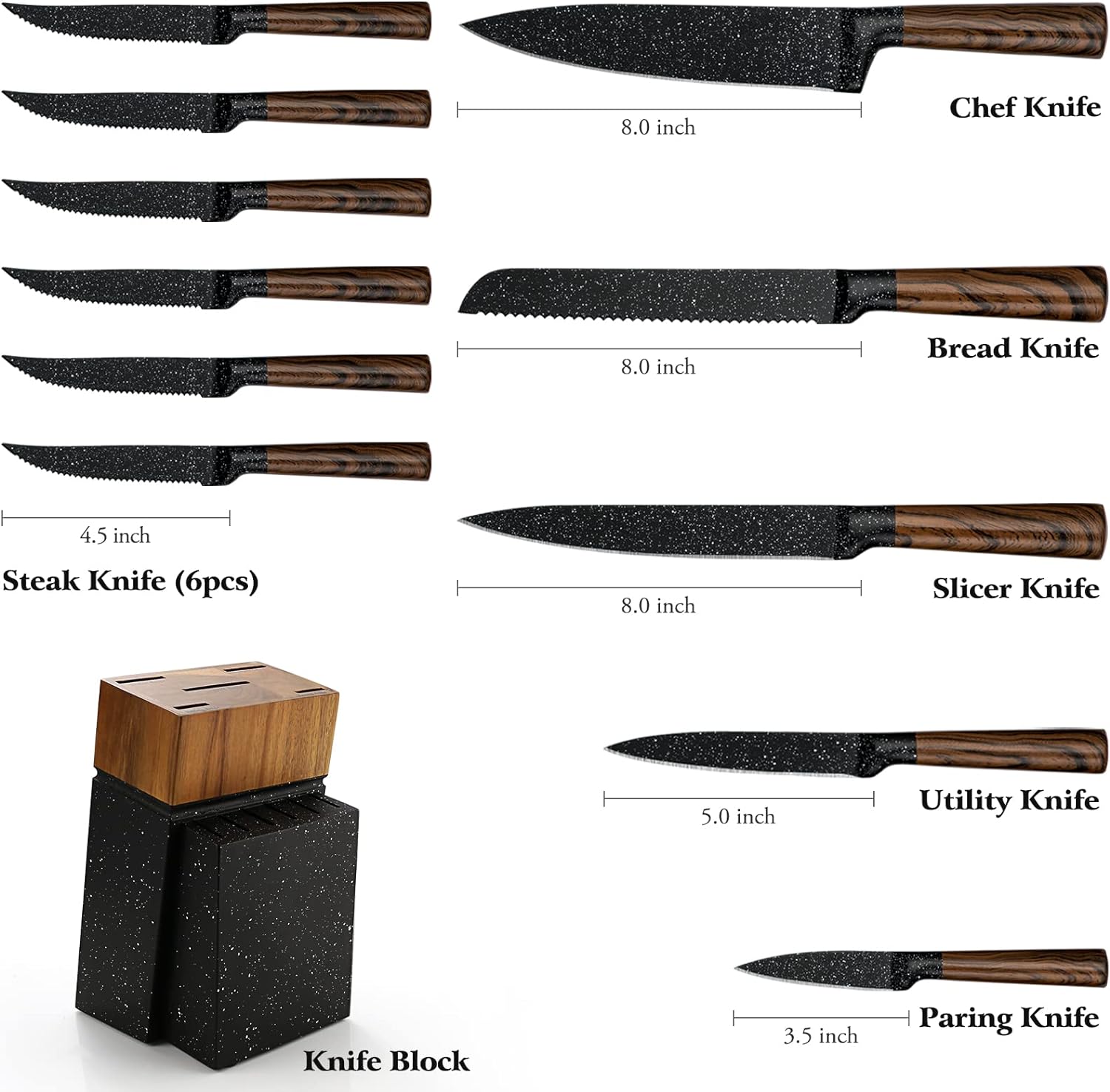 • 【EASY TO STORE AND CLEAN】 All Knives store safely in the Pakkawood knife block, ensure the long-term durability and corrosion resistance of the tool. The knife set with wooden block has non-slip rubber feet. Due to the weight of the block and the rubber feet of the floor, it is almost impossible to tilt or move it on the workbench. Wash them by hand and dry them by soft cloth immediately after each use will help to keep sharp and extend the service life.