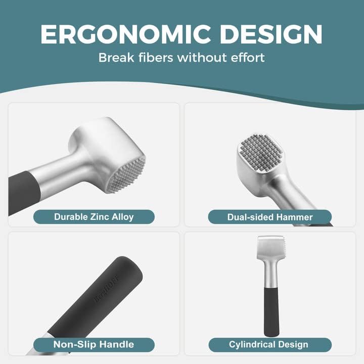 • Ergonomic Design: We are always looking for a meat tenderizer with a comfortable handle that fits perfectly in your hand. This meat hammer from Kitexpert fits that bill which allows the mallet and gravity to do all the work in less time. Enjoy your cooking time!