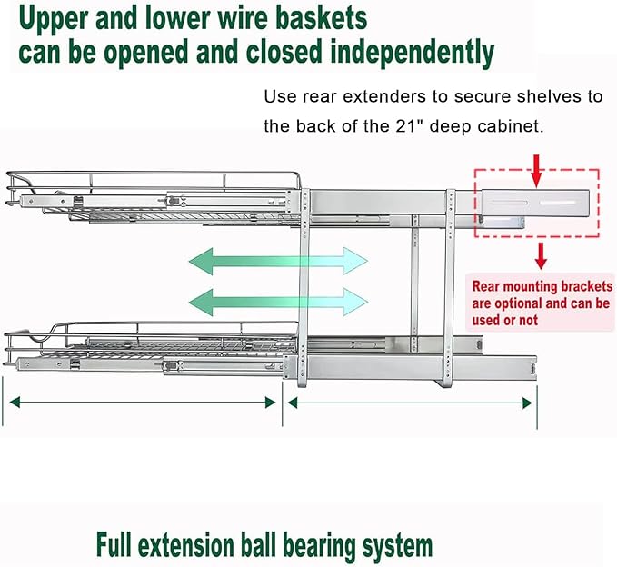 • ※ More Convenient and Practical: This Cabinet Slide Out Shelves both top and bottom shelves fully slide out independently on precision ball bearing slides so you can reach to your items easily and more quickly. Each tier can hold up max weight is 75 lbs without stretching, the weight capacity of each tier in the extended position is less than 40 lbs.