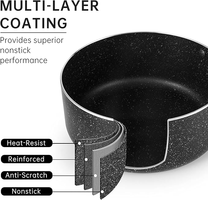 • [Multiple Layer Non Stick Coating]Premium non stick interior featured exceptionally durable, double coated, and scratch resistant,which is ideal for easy cooking,re-heating vegetables,sauces,pasta or soup.Easy to clean for superior nonstick performance,just clean by soft sponges.