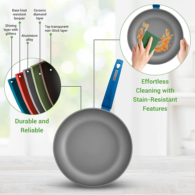 • NON-STICK COATING: The PTFE/PFOA/PFOS-free non stick pots and pans sets cooking ware features a long-lasting light gray nonstick coating inside for easy food release or tossing, cleaning & healthy cooking w/ blue heat resistant lacquer exterior