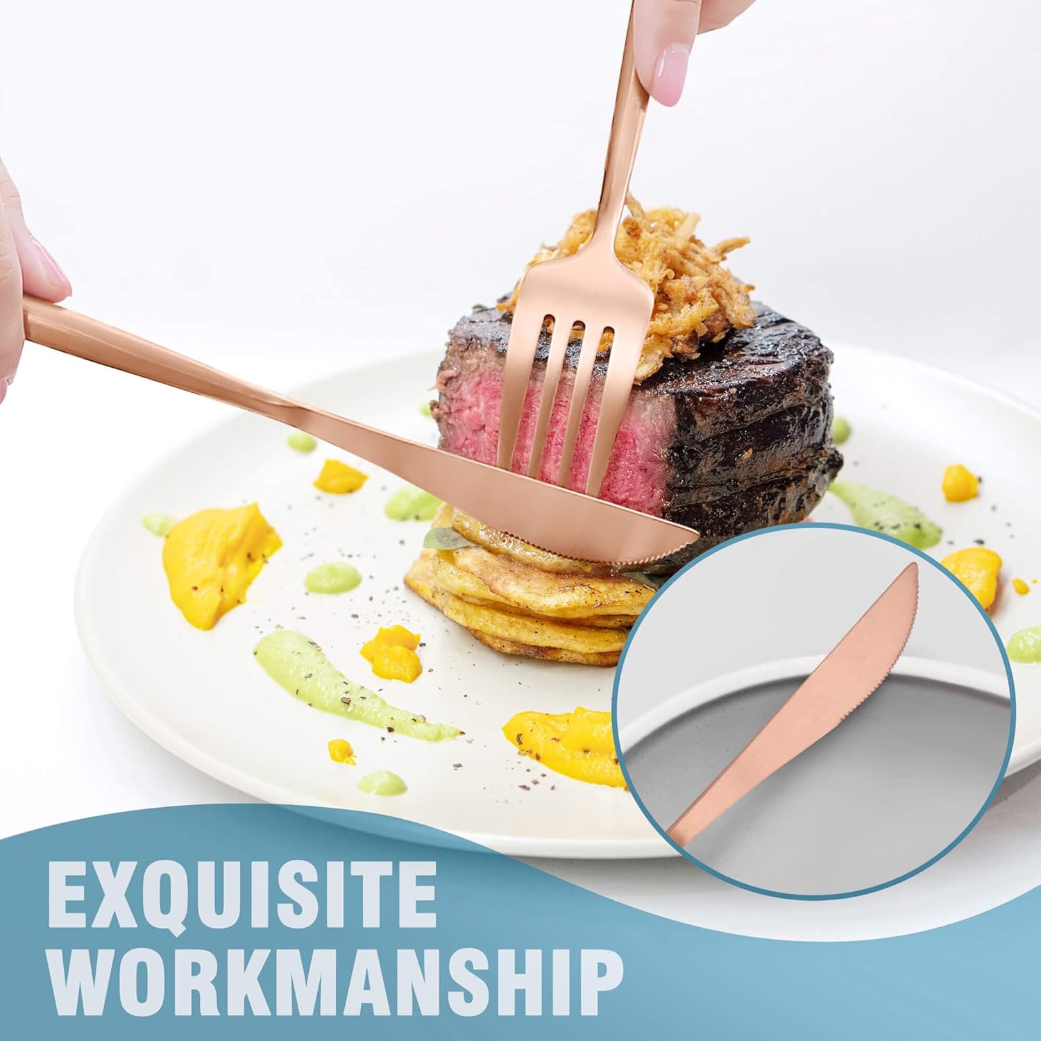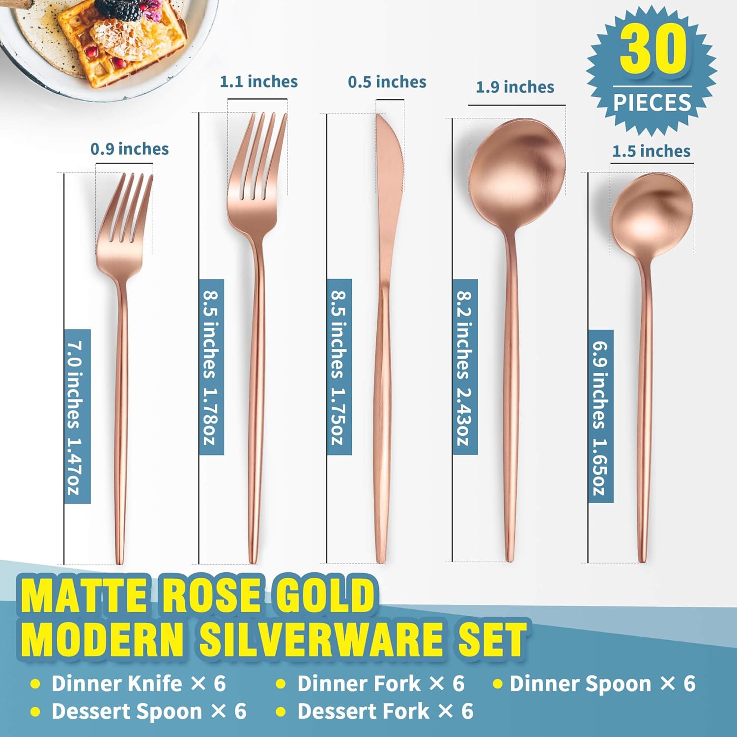 Lemeya Matte Rose Gold Silverware Set for 6,Modern Stainless Steel Brushed Cutlery Set,30-Pieces Heavy Duty Flatware Set,Knives Spoons and Forks Set Utensils Set, Satin Finish, Dishwasher Safe
