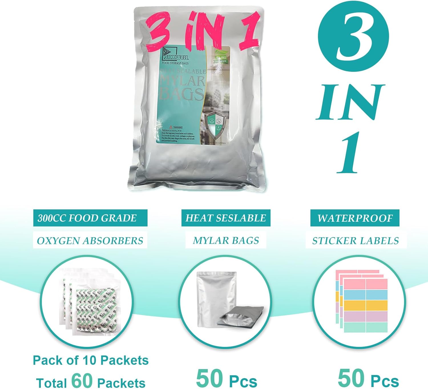 SHXWELL 50pcs 1 Quart Mylar Bags for Food Storage with Oxygen Absorbers 300CC (6 Packs of 10pcs) and Labels, 10 Mil 7"x10" Zipper Pouches Resealable and Heat Sealable for Long Term Food Storage