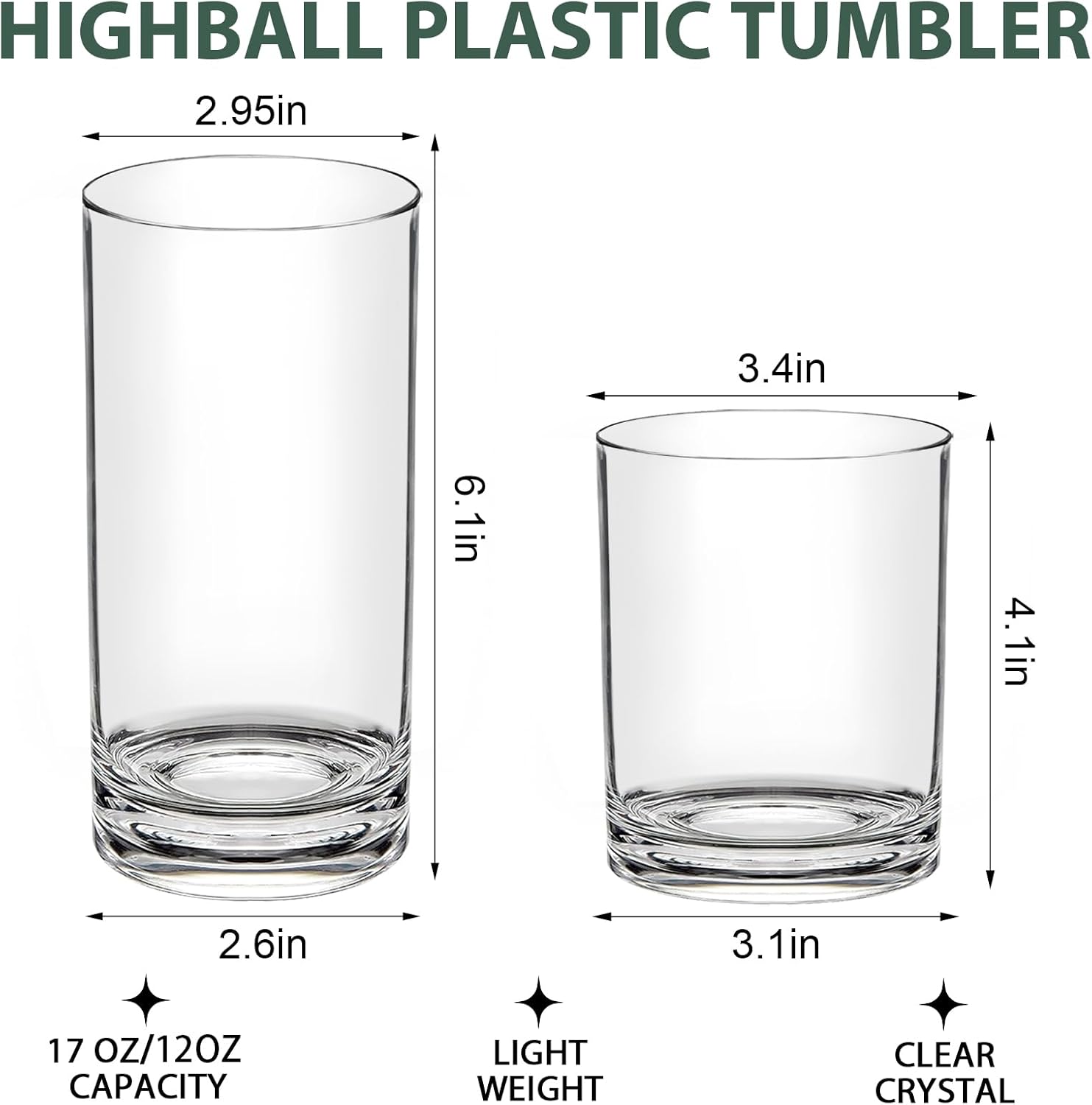 • PRACTICAL PLASTIC GLASSES DRINKING CUP: The Shatterproof plastic water glasses set of 12 include 6 pcs 12oz lowball glasses and 6 pcs 17 oz highball glasses,it is perfect cup sets for kitchen, resturant,picnic, apartment, RV,boat
