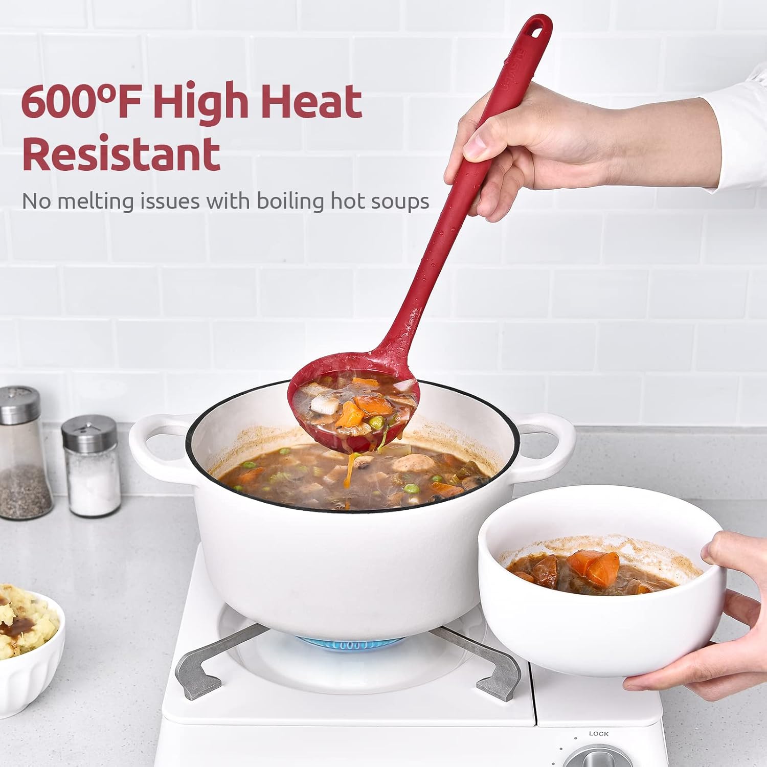 • [600ºF High Heat Resistant] It's made of BPA Free & food grade silicone and handles high heat well. If you forget and leave this kitchen ladle inside a pot of soup while you're eating dinner, it won't melt. You can use this cooking ladle for soups, thick chili, stews, gravy and other foodstuffs and it won't scratch your nonstick pots and pans. Integrated design makes it no small places for food to hide in! Goes through the dishwasher well or it's an easy, quick cleanup in the sink.