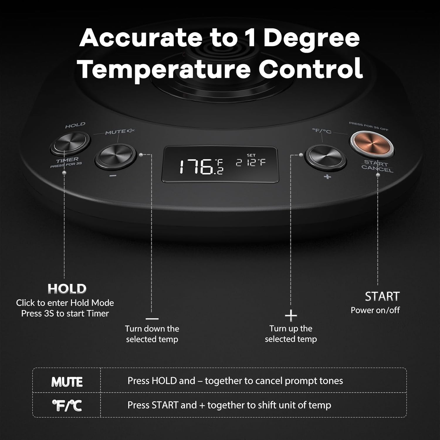 • Accurate Temperature Control and Realtime Display: Built in up-to-date advanced thermostat and 2.0 inch LCD display to show the realtime temperature and set temperature, and other information like hold time, mute mode, heating status, stopwatch. A single glimpse will give you all important parameters