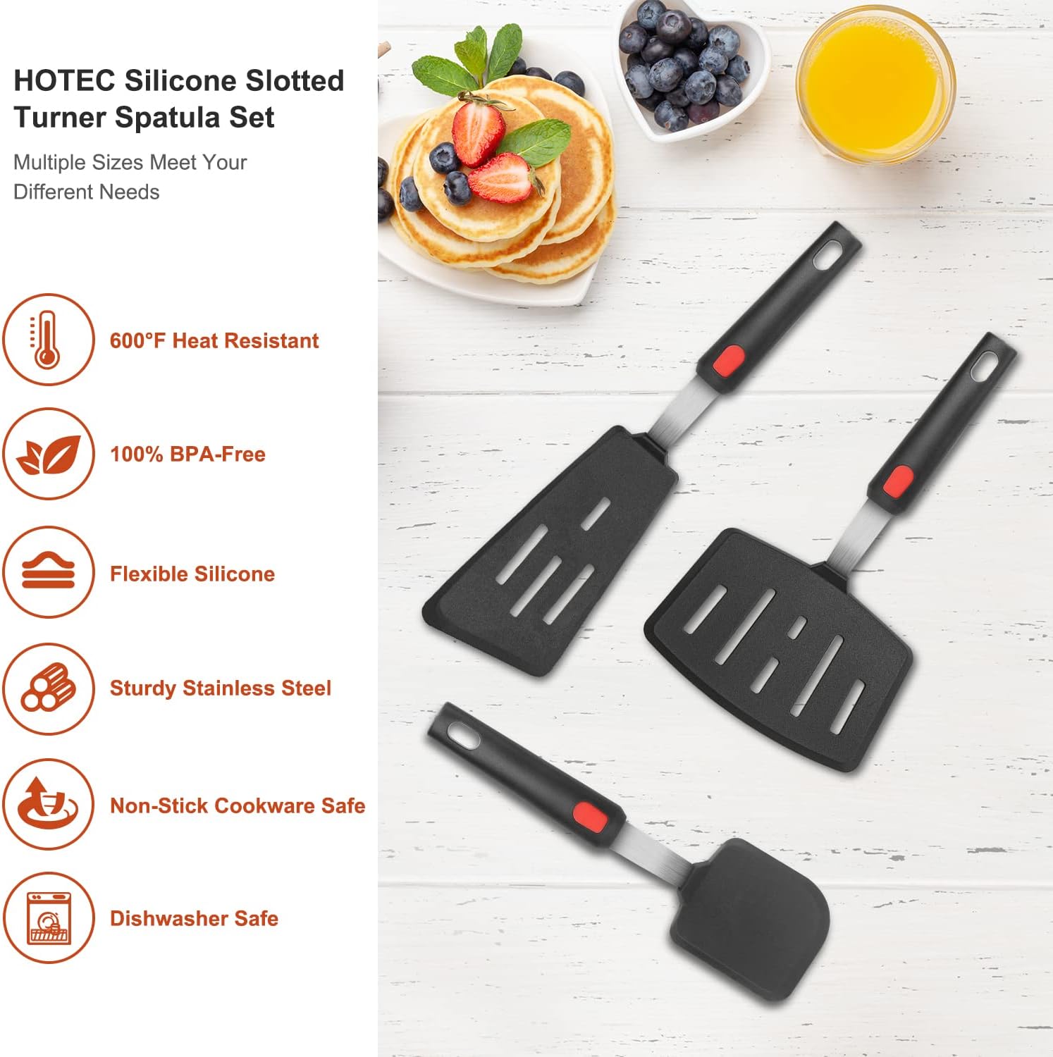 Hotec Silicone Spatula Turner for Nonstick Cookware, Cooking Spatulas 600°F Heat Resistant Large Flexible Rubber Spatula Set of 3, Kitchen Utensils for Flipping Eggs, Burgers, Pancakes, Crepes