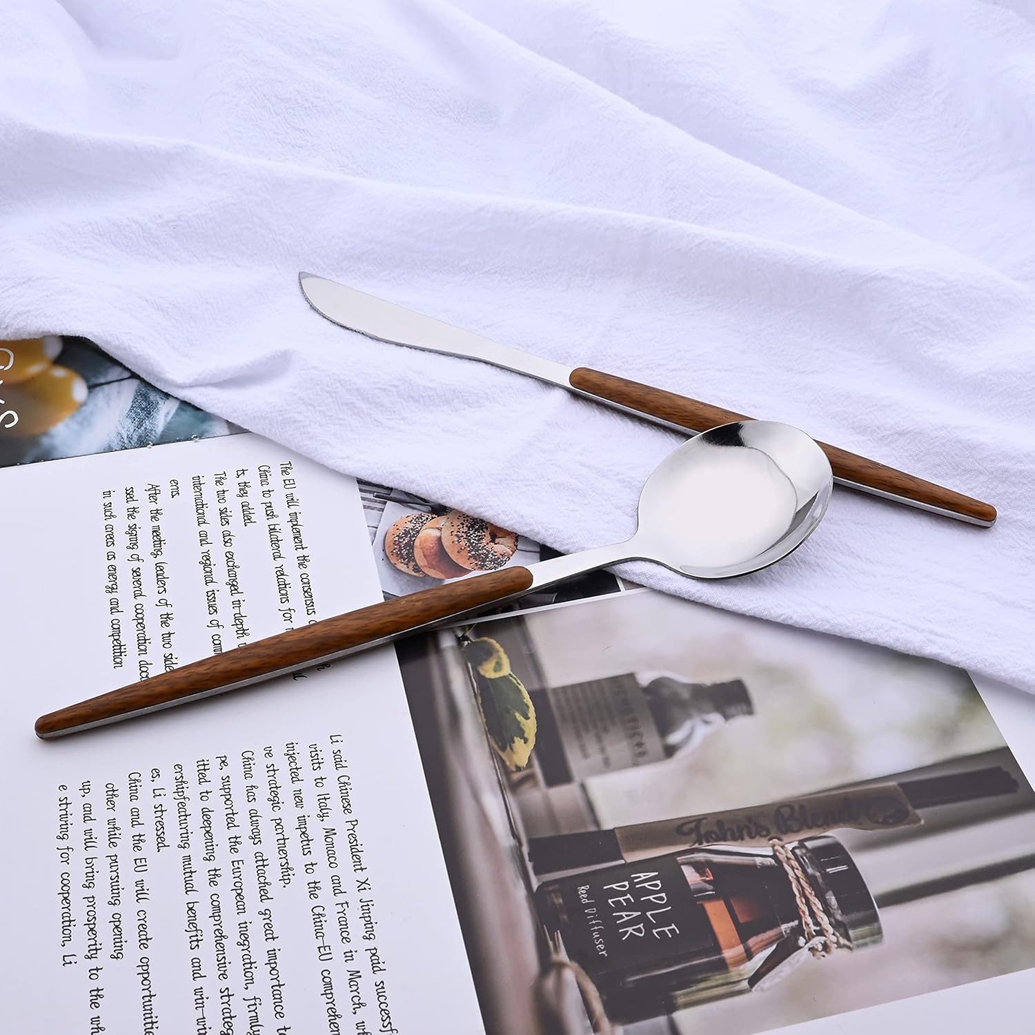 • 【HEALTHY MATERIAL & FASHION DESIGN】The silverware cutlery set made from premium stainless steel with exquisite mirror polish, sufficient thickness, Strong Anti Rust, not easy to bend and deform. which is durable and healthy for your daily use, the well-balanced weight and smoothly body curve make it very comfortable to handle in your hand.Wood grain printed on the handle,makes your dining table stand out.