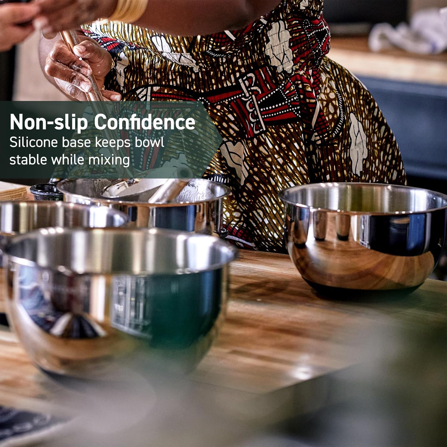 • HexClad Mixing Bowls made from durable high quality stainless steel; These bowls feature a non slip silicone base, so they stay put as you prepare your food, mix, and blend even at an angle