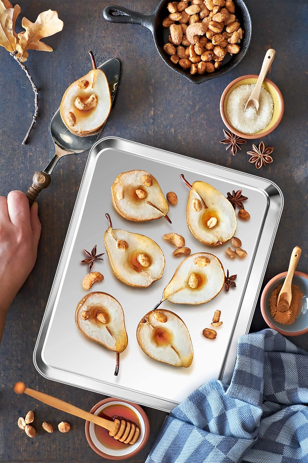 • 【12.5 INCH,SET OF 4】 Both trays 12.5 x 9.75 x 1 inch, Perfect for baking or roasting, Easy to make cookie, vegetables and meat, Also can be a serving pan and fruit container, Fit perfectly in your regular oven and toaster oven, You can bake different foods at the same time by 4-piece pans