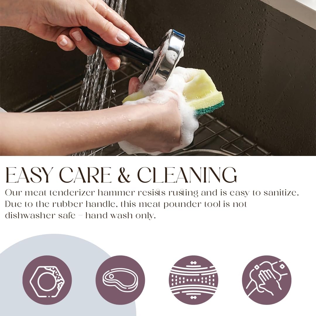 • EASY CARE & CLEANING: Our meat tenderizer hammer resists rusting and is easy to sanitize. Due to the rubber handle, this meat pounder tool is not dishwasher safe - hand wash only.