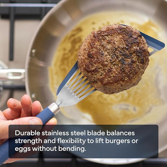 • PRECISION IN EVERY FLIP: This wide-slotted turner is perfect for cooking a variety of meals. Whether it's delicate eggs, sizzling fish, meaty burgers, or fluffy pancakes it allows you to fry and flip with ease, ensuring your creations are cooked just the way you desire.