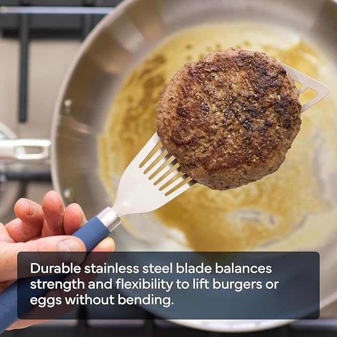 • PRECISION IN EVERY FLIP: This wide-slotted turner is perfect for cooking a variety of meals. Whether it's delicate eggs, sizzling fish, meaty burgers, or fluffy pancakes it allows you to fry and flip with ease, ensuring your creations are cooked just the way you desire.
