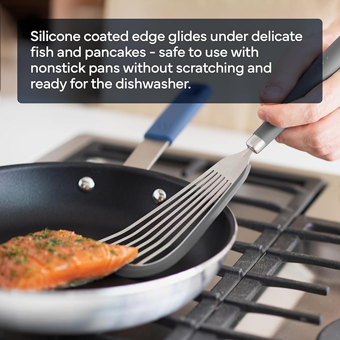 • PRECISION IN EVERY FLIP: This wide-slotted turner is perfect for cooking a variety of meals. Whether it's delicate eggs, sizzling fish, meaty burgers, or fluffy pancakes it allows you to fry and flip with ease, ensuring your creations are cooked just the way you desire.