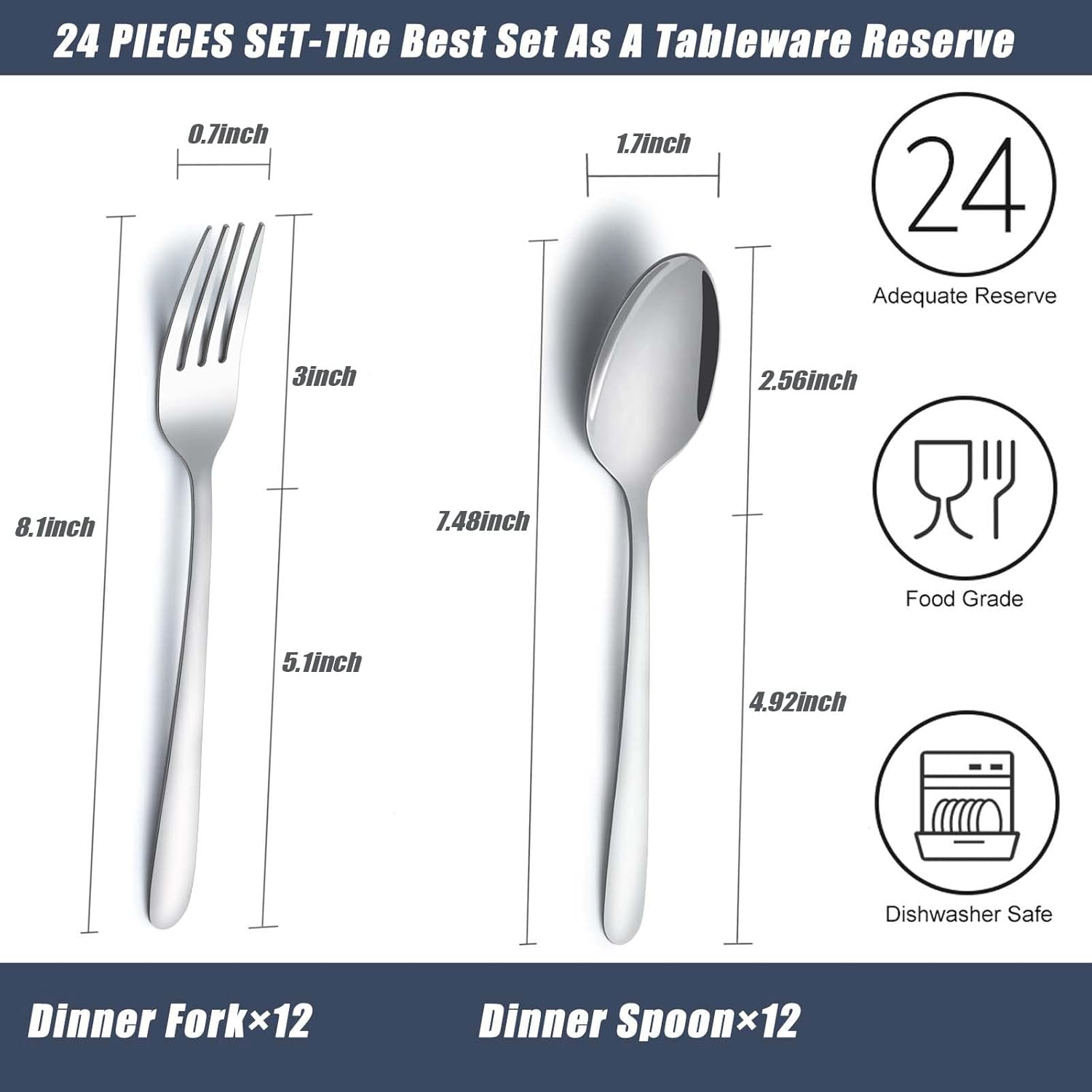 24 Pcs Forks and Spoons Silverware Set, Food Grade Stainless Steel Flatware Cutlery Set for Home, Kitchen and Restaurant, 12 Dinner Forks and Dinner Spoons, Mirror Polished & Dishwasher Safe