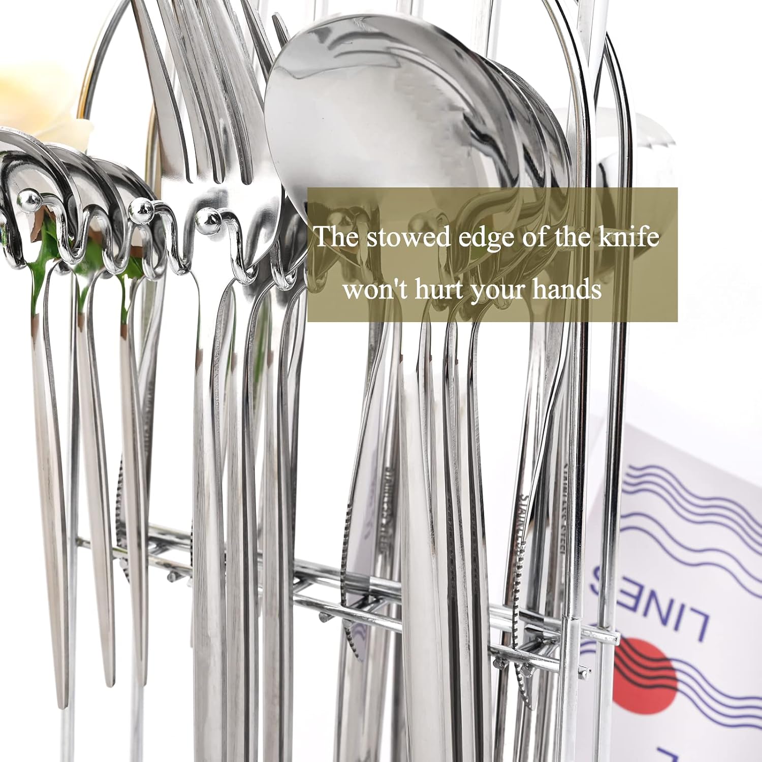 • 【Package Include】- 6 x Dinner Knife, 6 x Dinner Spoon, 6 x Dinner Fork, 6 x Teaspoon, 1 x Cutlery Rack