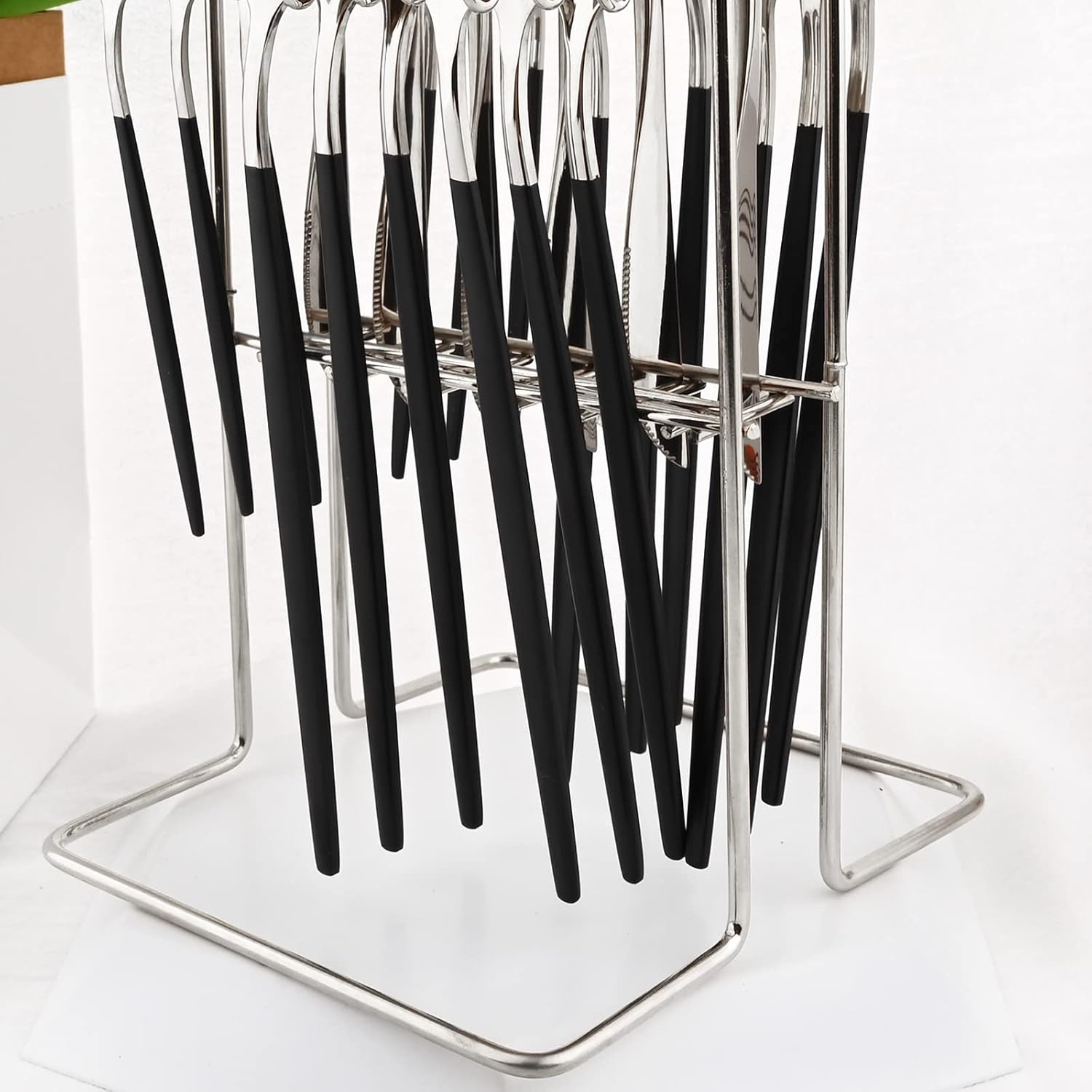 Black Silver 24Pcs Flatware Set With Stand, Lightweight Dinnerware Set Stainless Steel Cutlery With Black handles For Home Kitchen Wedding Party And Daily Use,Service For 6, Mirror Polish