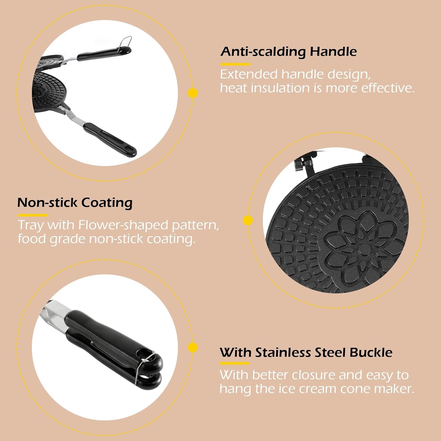 • Non-stick Waffle Cone Maker- The ice cream cone maker is coated food-grade surface, which is healthy and safe for you. Non-stick surface and easy to clean. (NOTE: only can be used for household gas stoves, not for induction cookers)