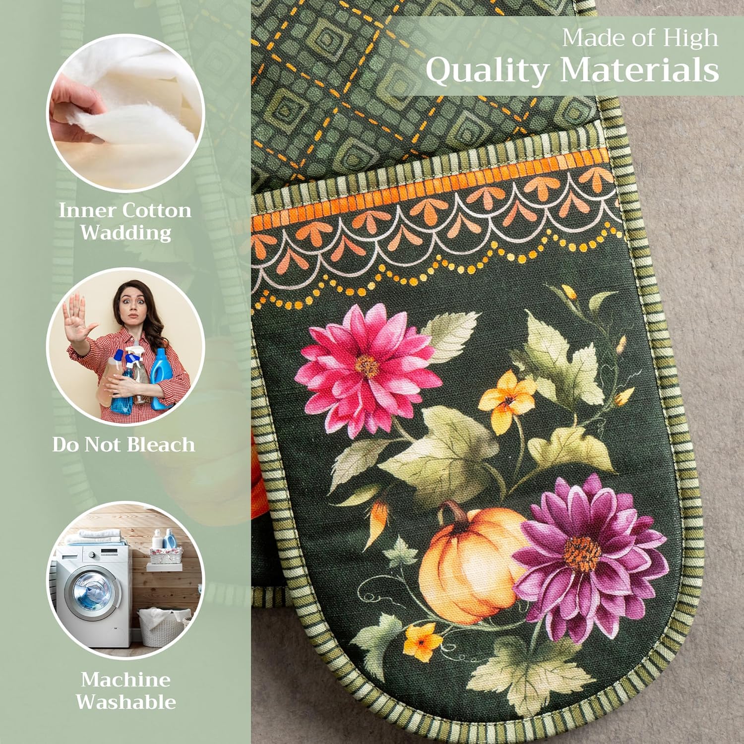 Maison d' Hermine Double Oven Mitt (7" x 35") 100% Cotton Heat Resistant BBQ Cooking Gloves with Loop for Thanksgiving Christmas Decorations Cooking Handling Hot Pan (Pumpkin Garden - Dark Green)