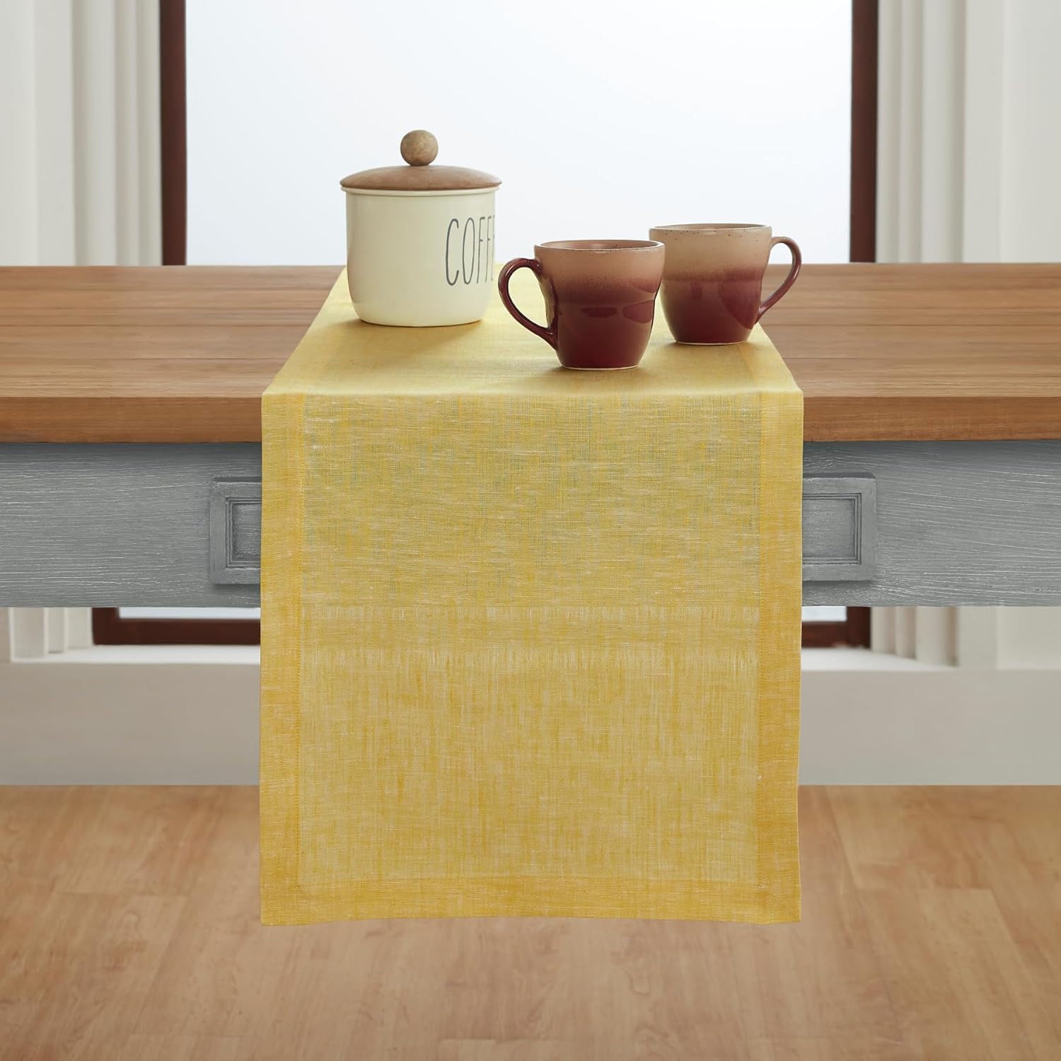 • 𝗖𝗼𝗺𝗽𝗼𝘀𝗶𝘁𝗶𝗼𝗻 𝗮𝗻𝗱 𝗖𝗿𝗮𝗳𝘁𝘀𝗺𝗮𝗻𝘀𝗵𝗶𝗽 : 100% Pure European Flax Linen Chambray Lemon Yellow Thanksgiving Table Runner - 𝗔𝘁𝗵𝗲𝗻𝗮 | Handcrafted By Skilled Artisans.