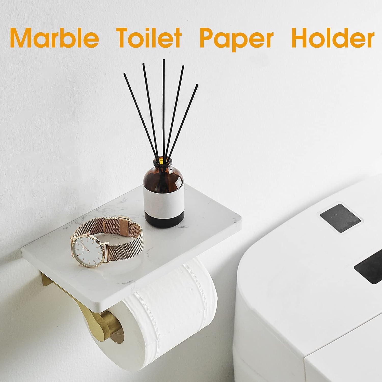 Hoimpro Brushed Gold Aluminum Toilet Paper Holder with White Natural Marble Shelf, Wall Mounted Tissue Hand Paper Roll Storage Holder for Bathroom Kitchen Washroom Bedroom
