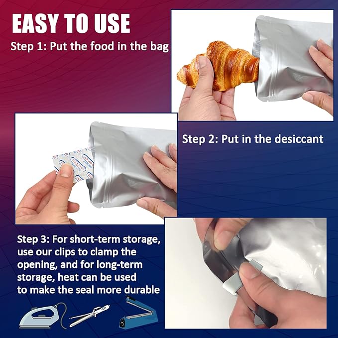 • What You Will Get : 3 sizes of mylar bags: 1 gallon ziplock bags (10"*14")*30 pcs, 1 quart reusable bags (6"*9")*30 pcs, small bag (4.3"*6.3")*40 pcs & 100 pcs 400cc oxygen absorbers for food storage (10 pcs/pack *10) and 200 pcs self-adhesive sticker Labels with 5 different colors and 10 pcs zipper bag clips