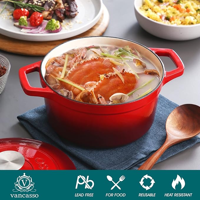 • 【Historic Enamel】Enamel used to be more precious than gold and was later used in the firing of the porcelain, which became the exclusive of the royal family. It was not until the 20th century that the French invented the enameled cast iron pot by combining iron and enamel techniques. The vancasso dutch oven uses a non-stick safety enamel coating, no cadmium or lead, and is non-toxic and harmless even at high temperatures. Easy to clean and will never fade.