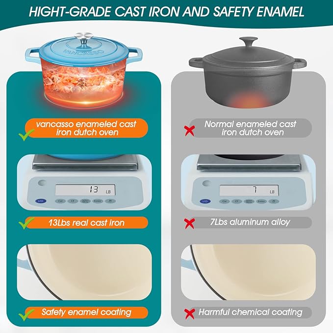 • 【13 LBS REAL CAST IRON】vancasso cast iron dutch oven pot's body made of high purity ore, with uniform thickness and even heat distribution. The heat retention is excellent, keeping food warm even when away from the heating source for a long time. There's no need to worry about food getting cold while waiting for family and friends to arrive. Be sure to use an oven mitt or pot holder when holding the Dutch oven; the handles can get very hot.