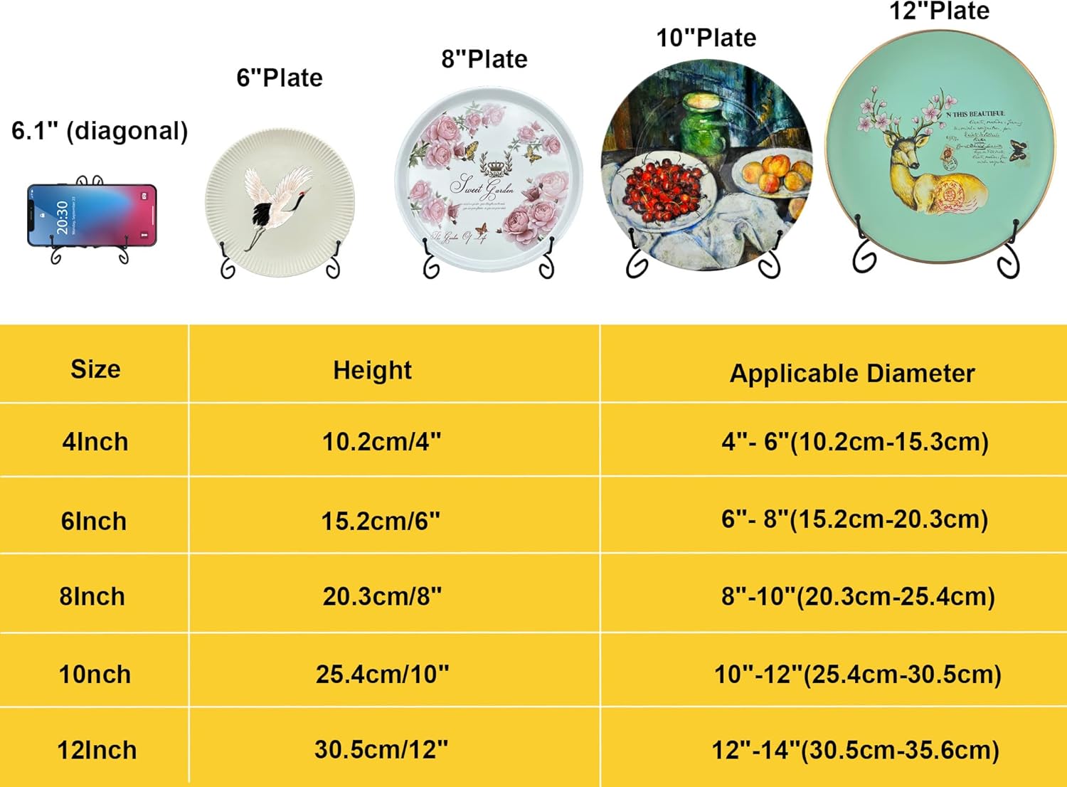 • Right Size Plate Stand for You, 8 inch plate stand for display fits for objects of 7″ - 10″ Height (Diameter), Lip Depth: 4.5 inch, Two Legs Open from 0’’ – 6.6’’. In addition, we provide (4″, 6″,8″,10″ and 12″) five different sizes of plate holder to enrich your choice, match your different size of collectibles perfectly.