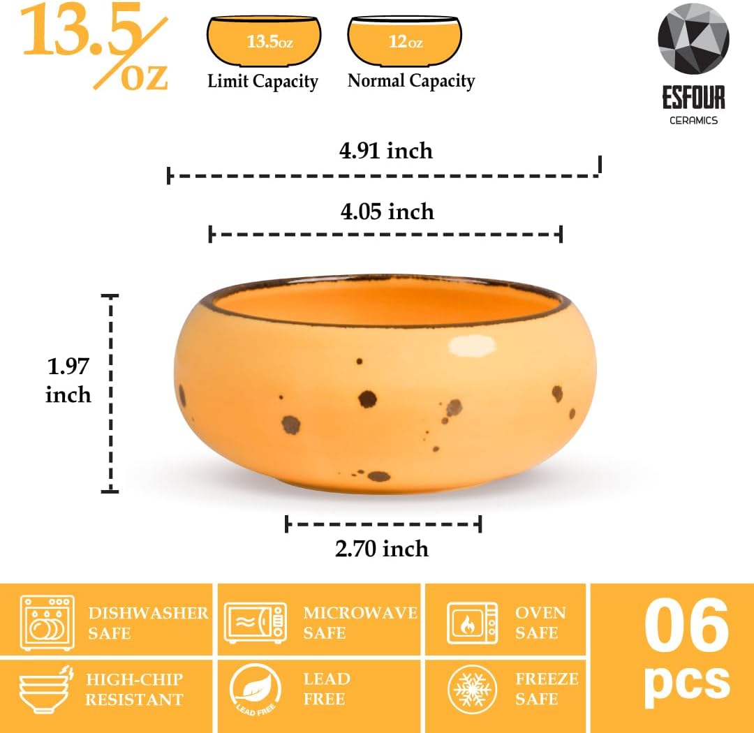 • HOME AND RESTAURANT KITCHENS: This set of ceramic bowls is functional and stylish. Esfour Ceramic Porcelain Bowls - Set of 6 High-Quality Small Soup and Cereal Bowls - Lead-Free, Microwave and Dishwasher Safe - Stylish French and Italian-Inspired Unique Designs - Stackable for Easy Storage - Ideal for Home and Professional Kitchens.