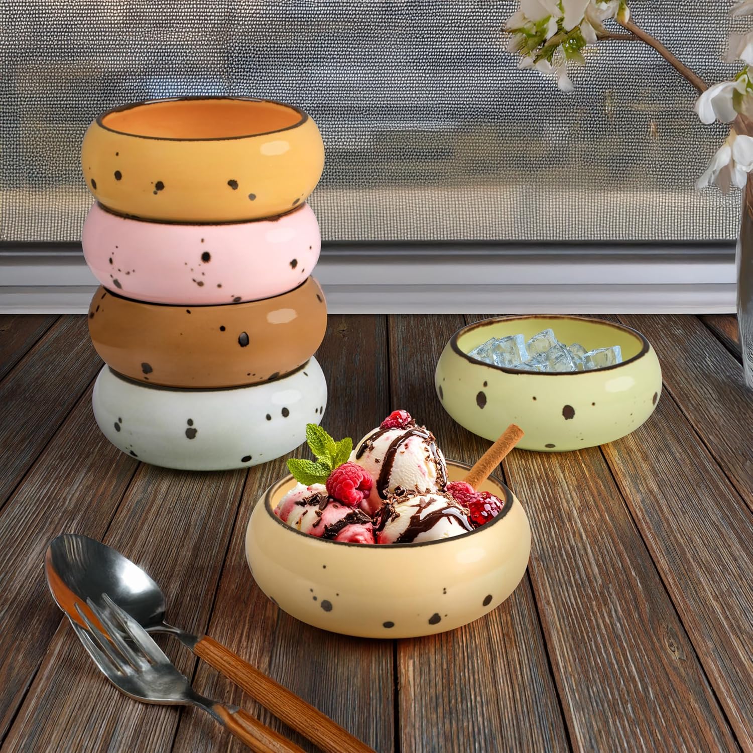 • IDEAL BOWL SIZE FOR VERSATILITY AND PRACTICALITY: The Natural Assorted Color Ceramic Bowls come in a set of 6 and are perfect for various Dessert uses, including Ice Cream, Soup, Snacks, Rice, Cereal, Chili, Side Dishes, Dips, mixed fruit, and more. Each bowl has a diameter of 4.9'' and a depth of 1.97'', with a maximum capacity of 13.5oz. These Small Dessert bowls are durable and elegant and made of high alumina porcelain.