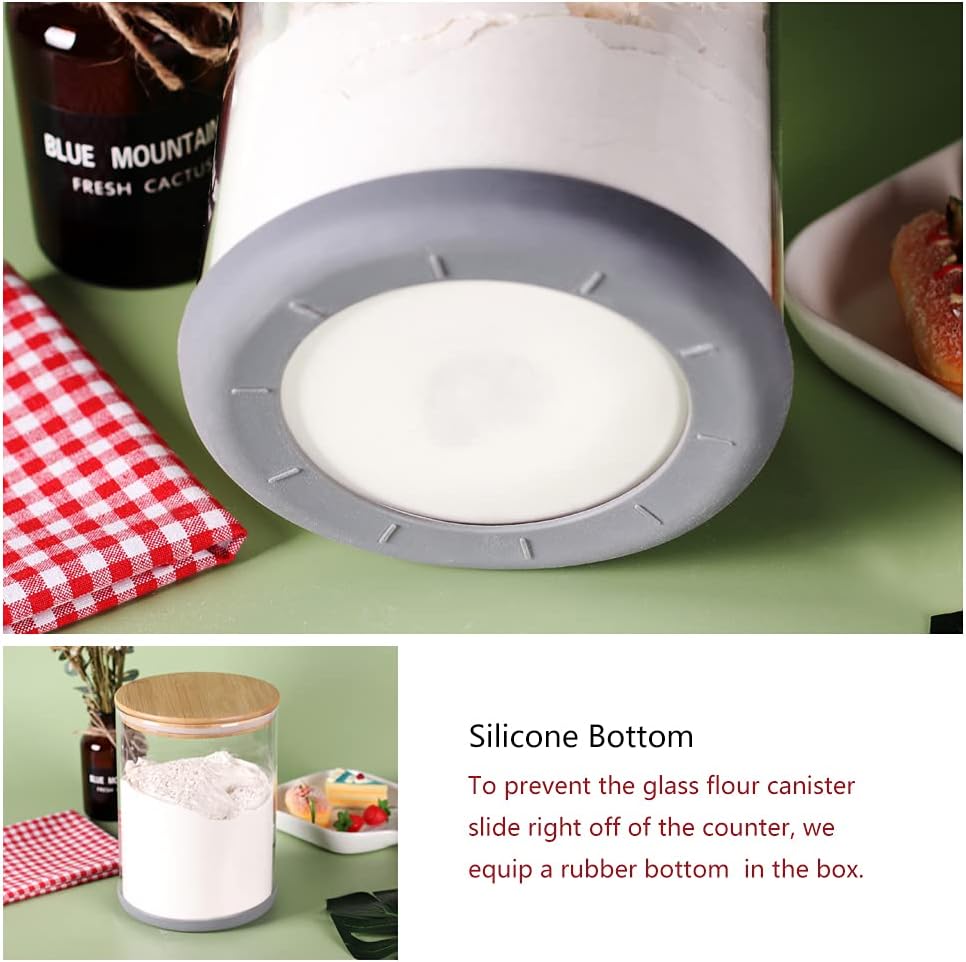 • [Silicone Bottom] To prevent the glass flour canister slide right off of the counter, we equip a anti-skid bottom ring in the box, which makes the container more safe in the pantry.