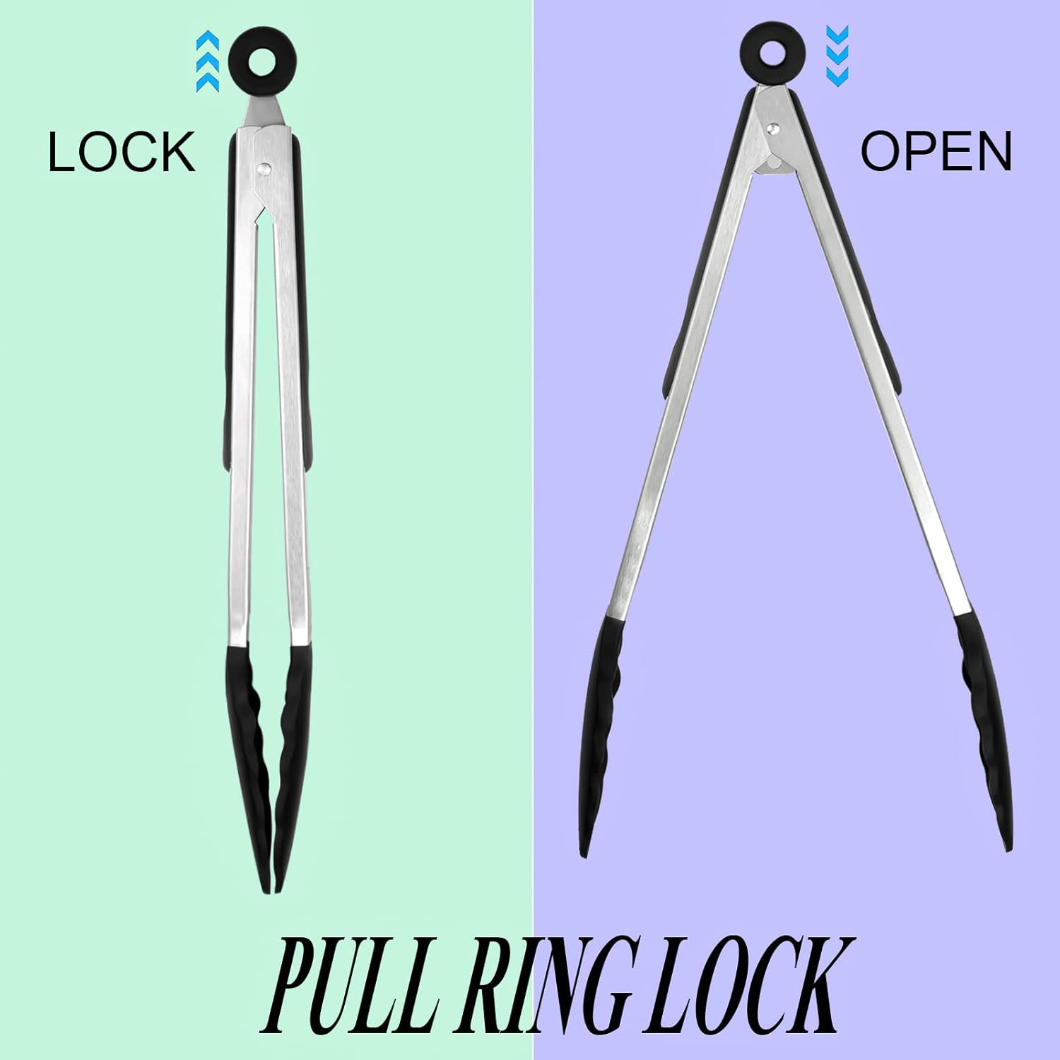 • EQUIPPED WITH A PULL-RING TECHNOLOGY: Our kitchen tongs are designed with a locking mechanism. The pull ring technology will keep your tongs from opening and closing. Simply pull the ring to lock and push to unlock.