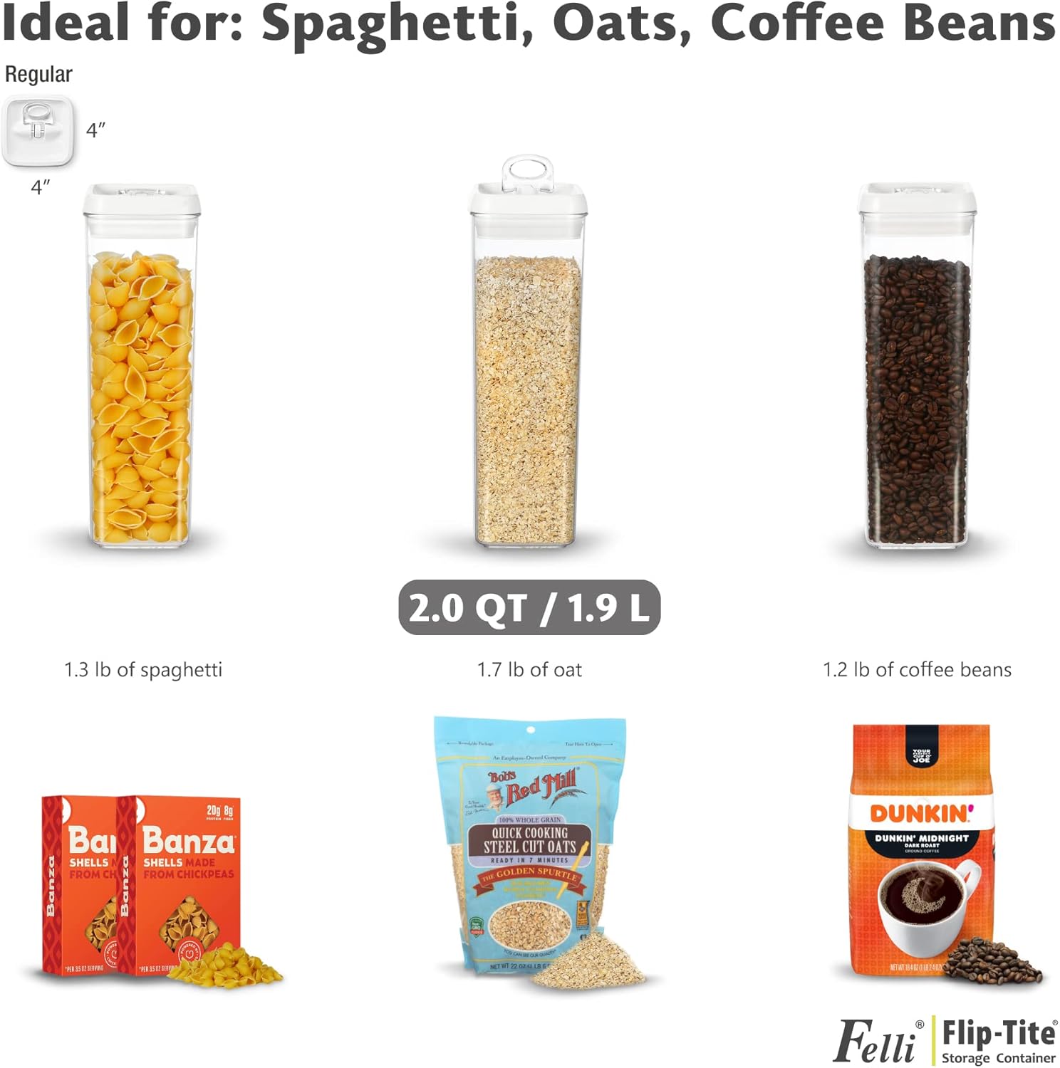 • AVAILABLE IN VARIOUS SIZES & SHAPES: The Felli Flip-Tite container comes in a variety of sizes and shapes to meet different food storage needs. The 4" REGULAR and RECTANGULAR sizes are perfect for organizing small kitchen counters and pantries, making handling and pouring easy. The 5" LARGE size is ideal for storing items like sugar and beans that need scooping. The 6" XL size is specifically designed for storing large quantities of food such as rice, powder, and flour, which require measuring spoons. We offer a versatile storage solution to suit all your needs.