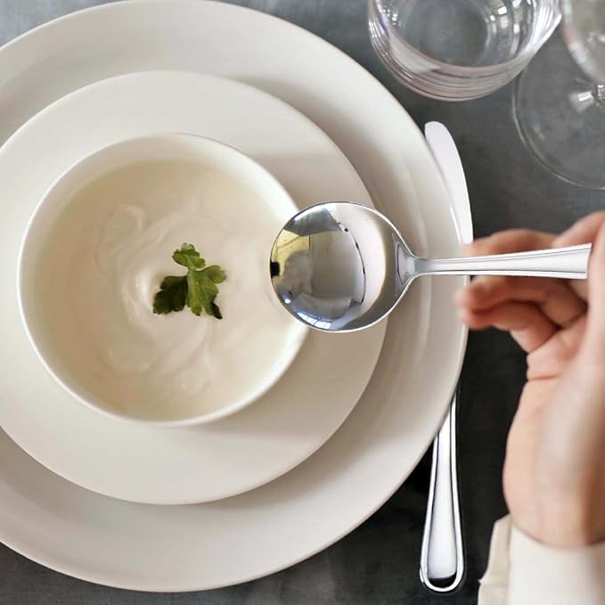 • PRODUCT INCLUDES: 24-piece Silver stainless stee flatware set includes 4 dinner knives, 4 dinner forks, 4 dinner spoons, 4 salad forks, 4 SOUP SPOONS and 4 teaspoons
