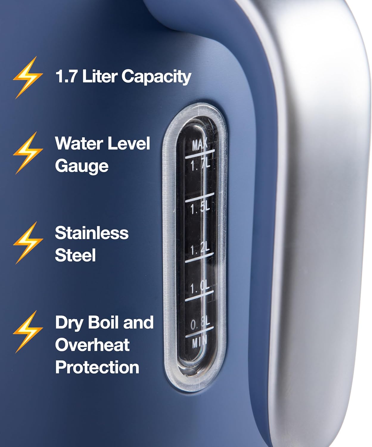 Rae Dunn Electric Hot Water Kettle - Stainless Steel Coffee Maker, Tea Kettle, Swivel Base, With Automatic Shut Off Boil-Dry Protection, Easy Pour Pitcher, 1500 Watt Boiling Power, 1.7 Liters, Navy